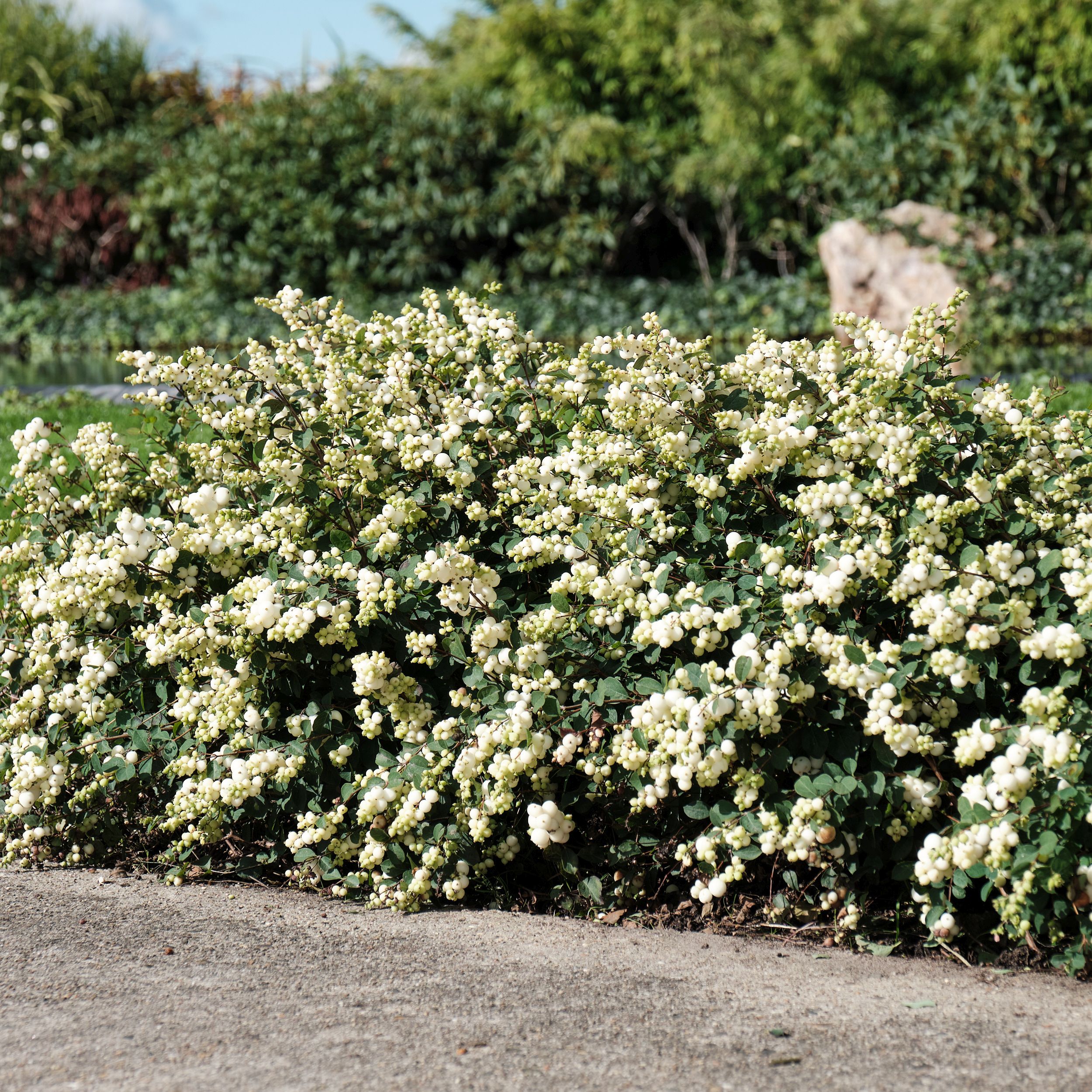 Diese schneeweiße Schneebeere ist eine sehr auffällige Erscheinung. Der Strauch weist einen kompakten Wuchs und eine sehr umfangreiche Beerenentwicklung auf.